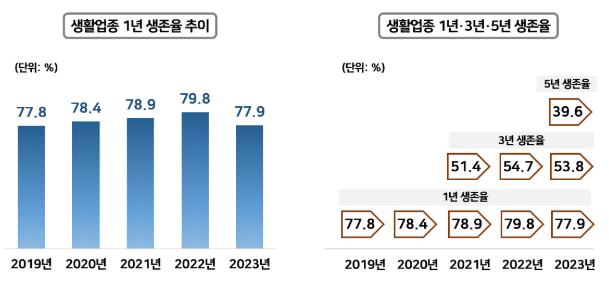 100대 생활업종의 1년 생존율은 2019년부터 2022년까지 상승세를 보이다가 2023년에 다소 하락했다. 3년 생존율은 2021년 51.4%, 2022년 54.7%, 2023년 53.8%로 나타났으며, 2023년 기준 5년 생존율은 39.6%였다.