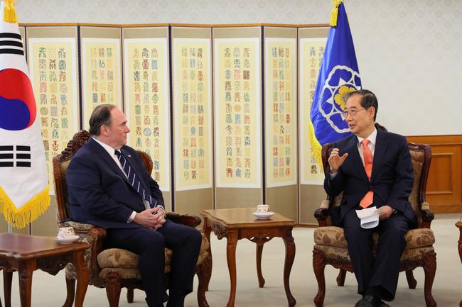 한 권한대행은 접견 자리에서 “한미동맹은 지난 70년간 가장 성공적인 동맹으로 진화해왔으며, 이는 한반도와 역내 평화·안정을 떠받치는 핵심축”이라며 “양국이 긴밀한 소통을 유지해 동맹이 지속적으로 발전해 나가길 기대한다”고 밝혔다. 이어 “현재 진행 중인 한미 통상협의도 그러한 노력의 일환”이라고 강조했다.
