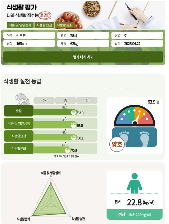 이 점검표는 이용자가 자신의 연령대에 맞는 문항을 체크하면 점수(100점 만점)와 실천 등급(상·중·하)으로 결과가 제시되며, 전국 평균 점수와의 비교도 가능하다. 특히 청소년용 점검표에는 계절별 추천 식단과 개인 맞춤형 조언도 함께 제공된다. 성인 및 노인용 조언 서비스도 순차 적용될 예정이다.