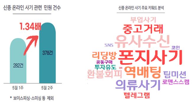 국민권익위가 지난 5월 5일부터 11일까지 민원분석시스템에 접수된 민원을 분석한 결과, `신종 온라인 사기` 관련 민원은 총 378건으로 지난주 282건 대비 1.34배 증가했다.