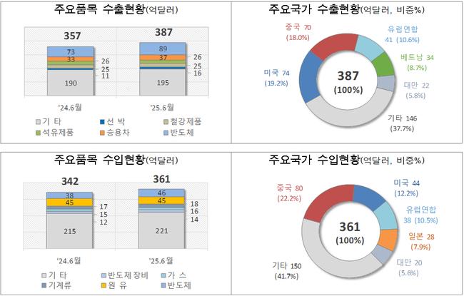 관세청이 발표한 6월 1일부터 20일까지의 수출입 실적(통관 기준 잠정치)에 따르면, 수출은 387억 달러로 전년 같은 기간보다 8.3%(29억7천만 달러) 증가했고, 수입은 361억 달러로 5.3%(18억1천만 달러) 늘었다. 이에 따라 무역수지는 26억 달러의 흑자를 기록했다.