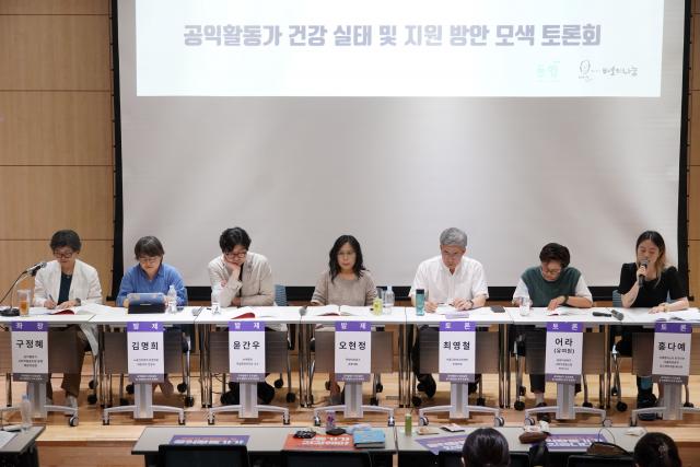 `공익활동가 건강실태 및 지원방안 모색 토론회`가 성황리 개최됐다. 왼쪽부터 구정혜 동행 배분위원장, 김명희 노동건강연대 운영위원, 윤간우 녹색병원 교수, 오현정 뜻밖의상담소 공동대표, 최영철 서울근로자건강센터 부센터장, 유여원 살림의료복지사회적협동조합 전무이사, 홍다예 국제앰네스티 한국지부 매니저(ⓒ공익활동가 사회적협동조합 동행)