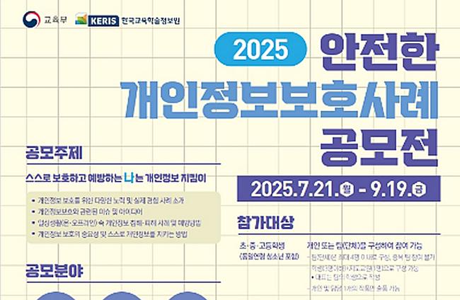 교육부와 한국교육학술정보원이 전국 초·중·고등학생과 대학생을 대상으로 ‘2025년 안전한 개인정보 보호 사례 공모전’을 개최한다. 공모전 접수는 7월 21일부터 9월 19일까지 진행되며, 수상자는 오는 11월 발표된다.
