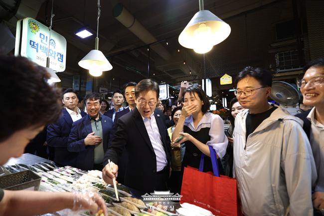 대통령 내외는 시장 곳곳을 둘러보며 상인들이 권한 순대, 떡볶이, 튀김, 떡 등을 직접 사서 참모들과 나눠 먹었고, 김 여사는 잠옷과 슬리퍼 등 생활용품과 돼지고기 등을 온누리상품권으로 구입했다. 한 순대가게 주인은 “백년가게로 지정된 점포인데 소비쿠폰 덕에 매출이 크게 늘었다”며 감사 인사를 전했다. 이에 이 대통령은 “아내가 내 쿠폰까지 인천 계양산시장에서 다 썼다”며 “소비쿠폰 덕에 시장에 활력이 돈다니 다행이다. 소상공인, 자영업자들이 살아야 나라 경제가 산다”고 화답했다.