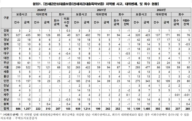 국토교통부는 이에 대해 “보증사고가 주로 수도권에 집중되어 있으며, 법원의 경매 적체 상황에 따라 지역별 회수율 차이가 발생한다”고 설명했다.