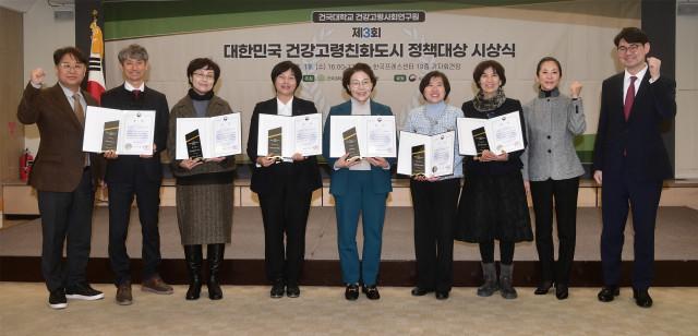 건국대학교 건강고령사회연구원(원장 이영범)이 주최하고 보건복지부가 후원하는 ‘제3회 대한민국 건강고령친화도시 정책대상’에서 초고령사회 대응을 위해 우수한 정책을 시행한 6개 지방자치단체가 수상의 영예를 안았다.