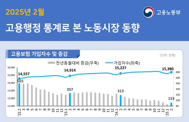 2025년 2월말 기준 고용보험 상시가입자는 1,538만명으로 전년동월대비 15만 3천명(+1.0%) 증가했다. 고용보험 상시가입자수는 작년 9월 1,545만명에서 올해 1월 1,517만명으로 감소세를 보이다가 2월에 다시 증가세로 전환되었다.